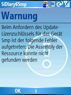 Auch in diesem Fall versucht SiDiary zunächst eine Internetverbindung aufzubauen und bringt nach ein paar Sekunden die folgende Fehlermeldung, bei der Sie auf 'OK' klicken können: