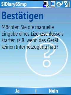SiDiary fragt dann, ob Sie den Lizenzschlüssel manuell eingeben wollen. Drücken Sie auf 'Ja':