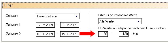 Nur eine Blutzuckermessung innerhalb dieses Intervalls wird bei der postprandialen Auswertung berücksichtigt.